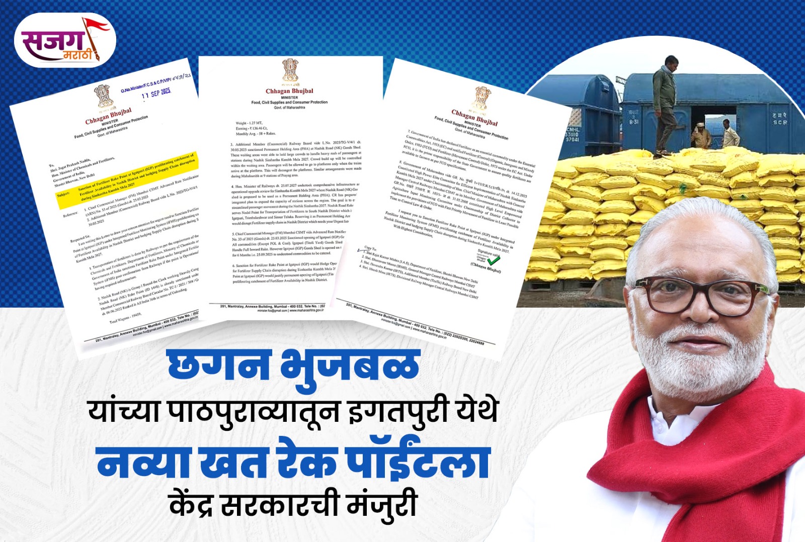 भुजबळांच्या प्रयत्नांतून ठाणे, पालघर, नाशिक जिल्ह्यातील शेतकऱ्यांना मोठा दिलासा; इगतपुरी खत रेक पॉईंटला मंजुरी