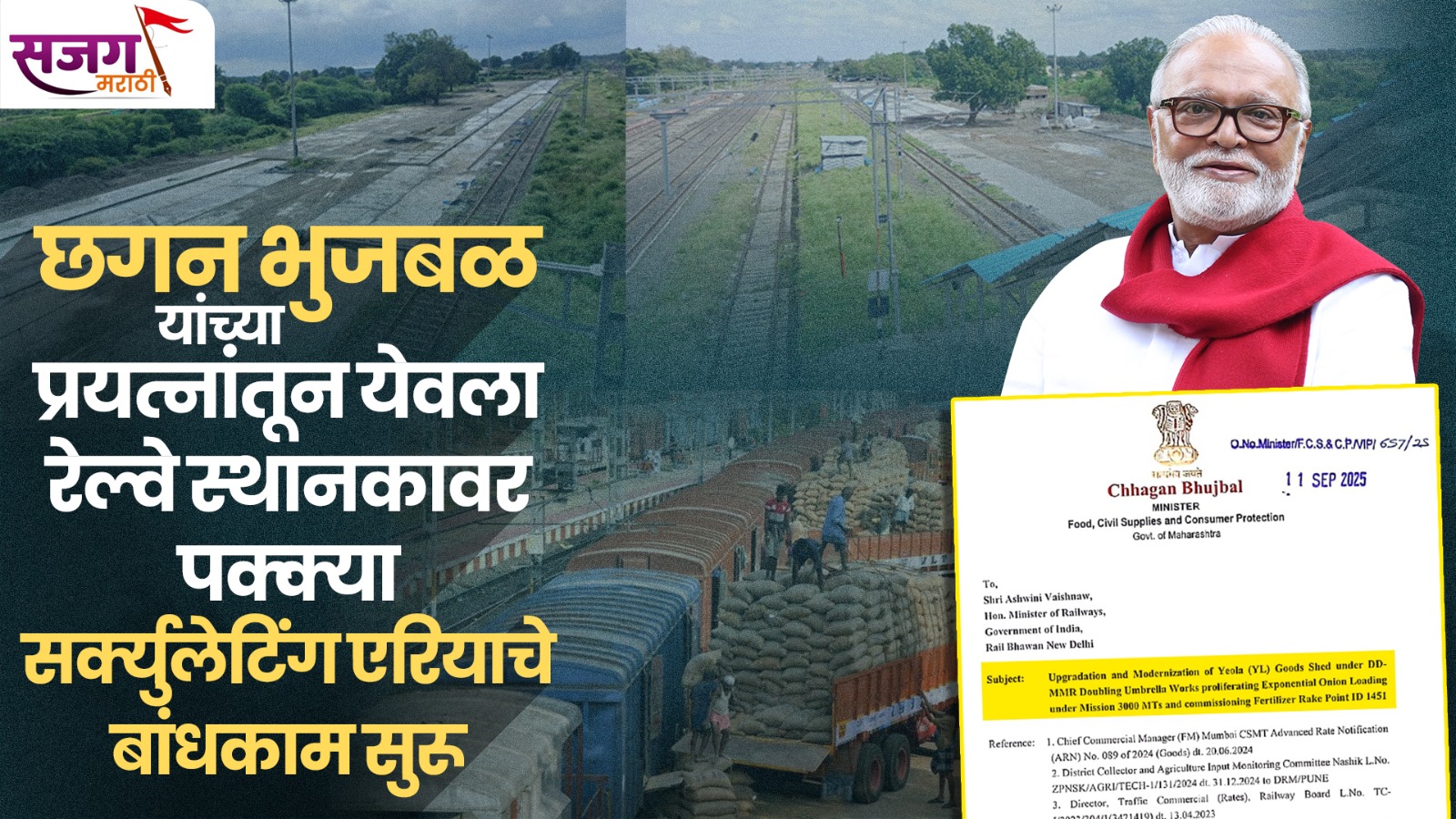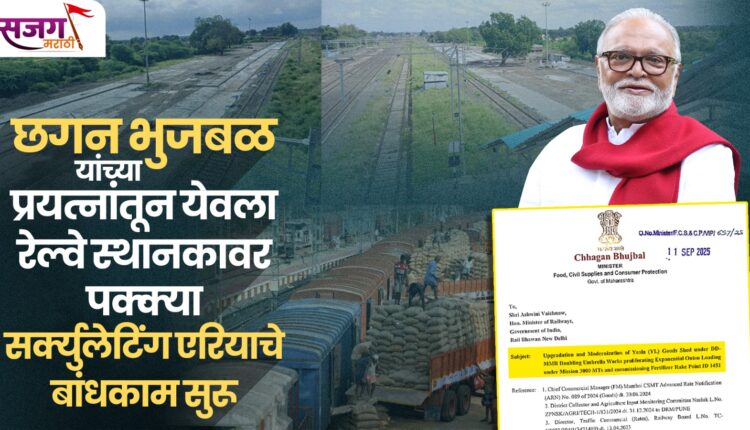 येवला, २८ ऑक्टोबर: येवला. एक ऐतिहासिक आणि शेतकरी-व्यापाऱ्यांच्या आर्थिक हिताशी निगडित असा प्रकल्प येवला रेल्वे स्थानकाच्या मालधक्क्यावर सुरू झाला आहे. राज्याचे अन्न, नागरी पुरवठा व ग्राहक संरक्षण मंत्री छगन भुजबळ यांच्या वर्षभराच्या सातत्याच्या पाठपुराव्याला यश मिळून आता येवला रेल्वे स्थानकावर पक्क्या सर्क्युलेटिंग एरियाचे बांधकाम सुरू झाले आहे. या आधुनिक सुविधेमुळे येवला परिसरातील शेतकऱ्यांसाठी वर्षाचे बाराही महिने कांद्यासह इतर शेतमाल मालगाडीत चढवणे आणि खते, सिमेंट यांसारखा माल उतरविणे हे काम सुकर होणार आहे. हा प्रकल्प शेतकरी आणि व्यापाऱ्यांच्या जीवनावर होणाऱ्या आर्थिक इजेचे निर्मूलन ठरणार आहे.