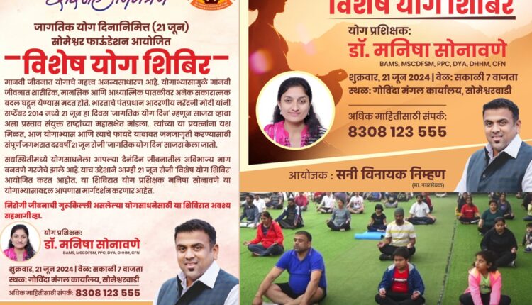 पुणे : सोमेश्वर फाउंडेशनच्यावतीने १० व्या जागतिक योग दिनानिमित्त विशेष योग शिबिराचे आयोजन करण्यात आले आहे. योगाभ्यासामुळे मानवी जीवनात शारीरिक, मानसिक आणि आध्यात्मिक पातळीवर अनेक सकारात्मक बदल घडून येण्यास मदत होते. सद्यस्थितीमध्ये योगसाधनेला आपल्या दैनंदिन जीवनातील अविभाज्य भाग बनवणे गरजेचे झाले आहे. आरोग्यमय जीवन जगण्यासाठी योगमय जीवनाला सुरुवात करणे गरजेचे आहे याच भावानेतून या विशेष योग शिबीरचे आयोजन करण्यात आले असल्याची माहिती पुणे मनपाचे माजी नगरसेवक सनी निम्हण यांनी दिली आहे.