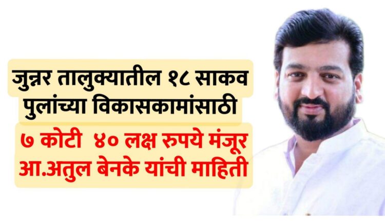 महाराष्ट्र राज्याचे उपमुख्यमंत्री तथा पुणे जिल्ह्याचे पालकमंत्री अजित पवार, राज्याचे गृहमंत्री दिलीप वळसे-पाटील, शिरूर लोकसभा मतदारसंघाचे खासदार डॉ अमोल कोल्हे यांच्या माध्यमातून जिल्हा वार्षिक योजना ( सर्व साधारण, अनुसूचित जाती उपयोजना, आदिवासी उपयोजना) सन २१-२२ अंतर्गत जुन्नर तालुक्यातील १८ साकव पुलांच्या बांधकामासाठी ७ कोटी ४० लक्ष ३५ हजार रुपये मंजूर झाल्याची माहिती आमदार अतुल बेनके यांनी दिली.