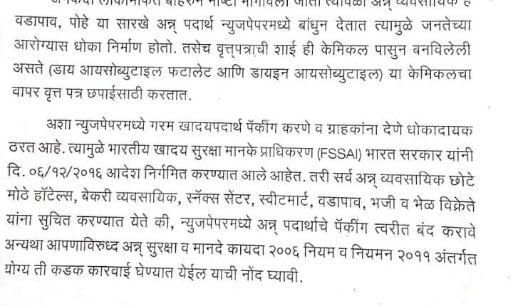 वृत्तपत्राची शाई ही केमिकल पासुन बनविलेली असते (डाय आयसोब्युटाइल फटालेट आणि डायइन आयसोब्युटाइल) केमिकलचा वापर वृत्तपत्र छपाईसाठी करतात. न्युजपेपरमध्ये गरम खाद्यपदार्थ पॅकींग करून ग्राहकांना देणे धोकादायक आहे. सर्व अन्न व्यवसायिक, हॉटेल्स, बेकरी व्यवसायिक, स्नॅक्स सेंटर, स्वीटमार्ट, वडापाव, भजी व भेळ विक्रेते यांनी न्युजपेपरमध्ये अन्न पदार्थाचे पॅकींग त्वरीत बंद करावे अन्यथा अन्न सुरक्षा व मानदे कायद्या अंतर्गत कडक कारवाई घेण्यात येईल, असे अन्न व औषध प्रशासन विभागाचे सहआयुक्त शि.स.देसाई यांनी कळविले आहे.