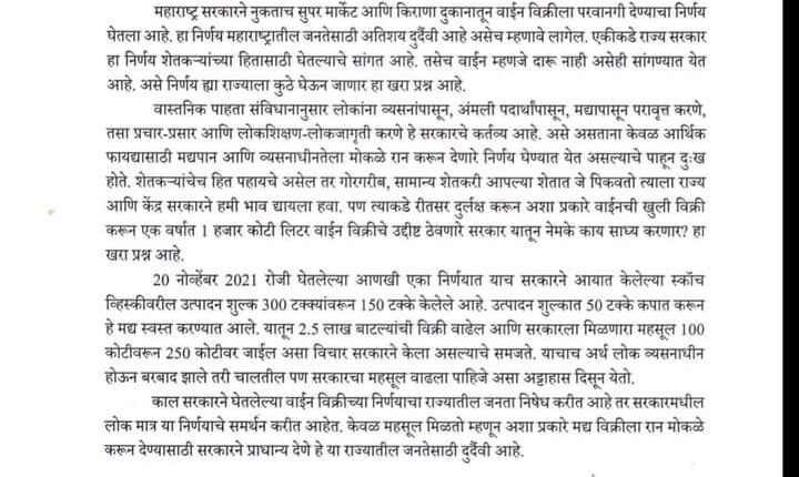 वास्तविक पाहता संविधानानुसार लोकांना व्यसनांपासून, अंमली पदार्थांपासून, मद्यापासून परावृत्त करणे, तसा प्रचार-प्रसार आणि लोकशिक्षण-लोकजागृती करणे हे सरकारचे कर्तव्य आहे. असे असताना केवळ आर्थिक फायद्यासाठी मद्यपान आणि व्यसनाधीनतेला मोकळे रान करून देणारे निर्णय घेण्यात येत असल्याचे पाहून दुःख होते. शेतकऱ्यांचेच हित पहायचे असेल तर गोरगरीब, सामान्य शेतकरी आपल्या शेतात जे पिकवतो त्याला राज्य आणि केंद्र सरकारने हमी भाव द्यायला हवा. पण त्याकडे रीतसर दुर्लक्ष करून अशा प्रकारे वाईनची खुली विक्री करून एक वर्षात 1 हजार कोटी लिटर वाईन विक्रीचे उद्दीष्ट ठेवणारे सरकार यातून नेमके काय साध्य करणार? हा खरा प्रश्न आहे. 20 नोव्हेंबर 2021 रोजी घेतलेल्या आणखी एका निर्णयात याच सरकारने आयात केलेल्या स्कॉच व्हिस्कीवरील उत्पादन शुल्क 300 टक्क्यांवरून 150 टक्के केलेले आहे. उत्पादन शुल्कात 50 टक्के कपात करून हे मद्य स्वस्त करण्यात आले. यातून 2.5 लाख बाटल्यांची विक्री वाढेल आणि सरकारला मिळणारा महसूल 100 कोटीवरून 250 कोटीवर जाईल असा विचार सरकारने केला असल्याचे समजते. याचाच अर्थ लोक व्यसनाधीन होऊन बरबाद झाले तरी चालतील पण सरकारचा महसूल वाढला पाहिजे असा अट्टाहास दिसून येतो. काल सरकारने घेतलेल्या वाईन विक्रीच्या निर्णयाचा राज्यातील जनता निषेध करीत आहे तर सरकारमधील लोक मात्र या निर्णयाचे समर्थन करीत आहेत. केवळ महसूल मिळतो म्हणून अशा प्रकारे मद्य विक्रीला रान मोकळे करून देण्यासाठी सरकारने प्राधान्य देणे हे या राज्यातील जनतेसाठी दुर्दैवी आहे. – कि.बा.हजारे (आण्णा हजारे)